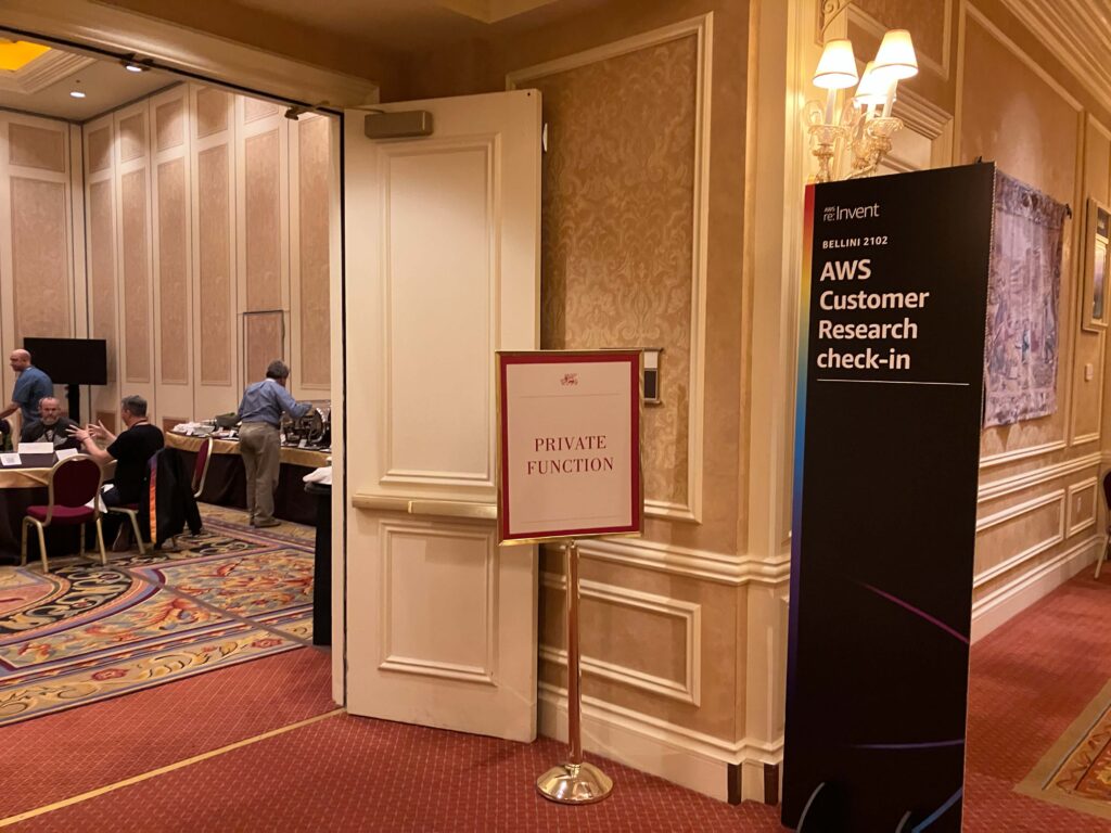 來到了小組討論的會場,我們會先在這個小房間用餐。用餐完後,會被帶到其他的會議室,我這一組有5個人。會議室中有錄影跟錄音,AWS team會針對顧客使用的服務提出些問題,我們再分享自已公司如何運作跟遇到的挑戰,並提供些建議。討論時間有90分鐘,整體來說還蠻有趣的,可以了解不同公司的運作跟觀點。在座只有我是第一次參加re:Invent,他們也給了我很多的建議,例如不用趕太多會場,專注在一個地方就好。