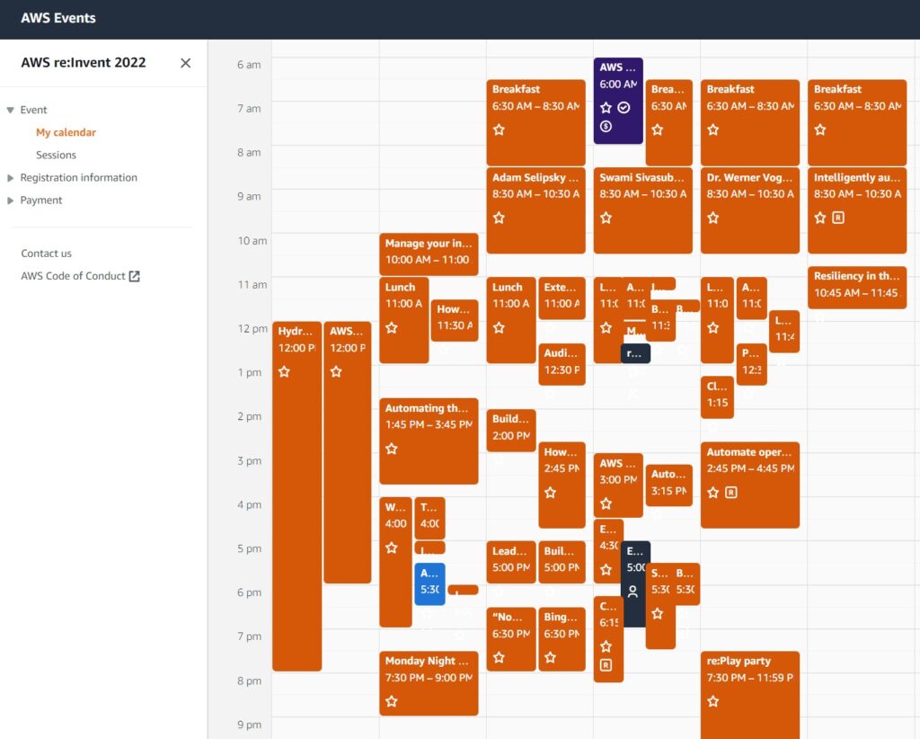 線上報名後,就可以登入re:Invnet的網站查看Sessions。每個Session提供大約10-20%的預約座位,10月份左右,就可以開始線上預約你有興趣的sessions。有線上預約的人必須在session開始前10分鐘到場,如果沒到,就會開放給現場排隊的人。雖然re:Invent的sessions相當多,有2千多個! 但就像大學選課一樣,熱門的課程很快就額滿了。