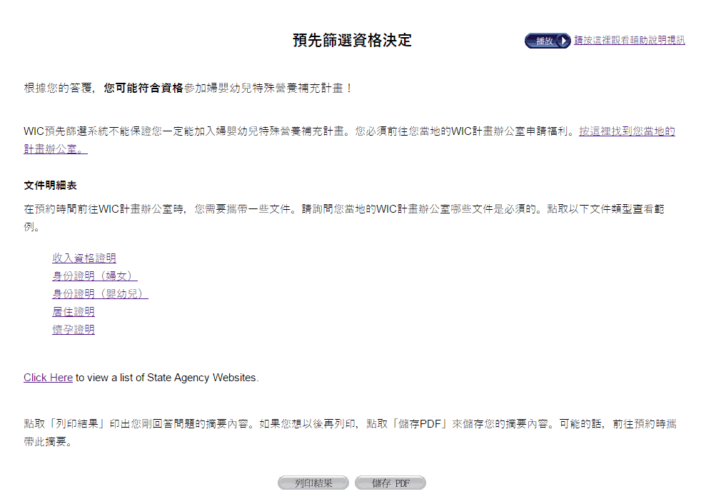 頁面底下點擊”列印結果”,可以印出報告,這報告要帶去當地的WIC辦公室。