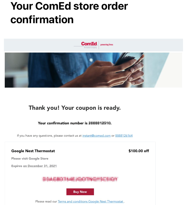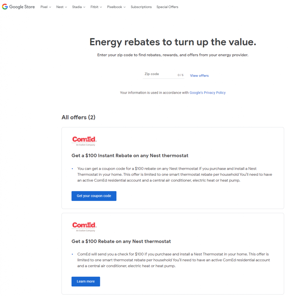 首先到Google Store Energy rebates頁面,輸入你的Zip code,查看所在的電力公司有那些補助方案。例如我在伊利諾州,ComEd就補助$100更換Nest。條件是要有ComEd的用戶帳號,且每一戶只能用一次。