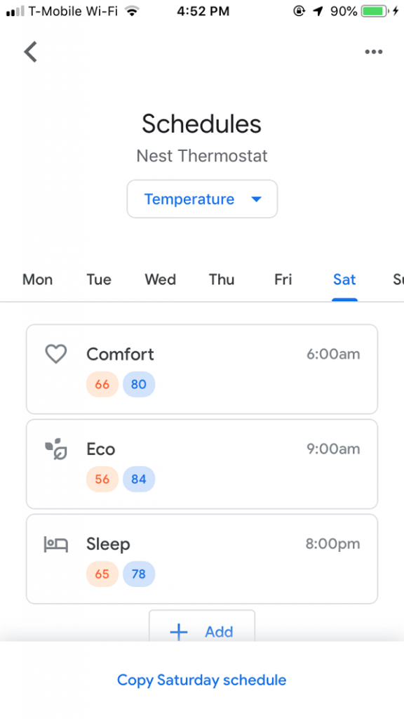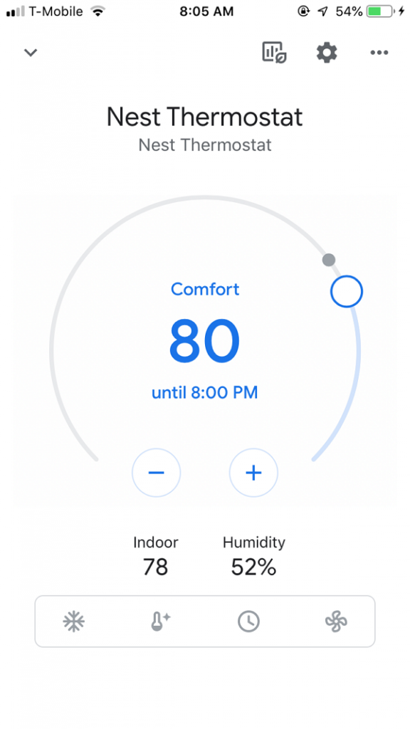 因為Google Nest連上Wifi,所以我可以用Google Home App,在手機上查看現在的溫度與濕度,並調整溫度。再懶一點,可以直接對著Google Nest Mini或是Amazon Echo,聲控調整溫度。