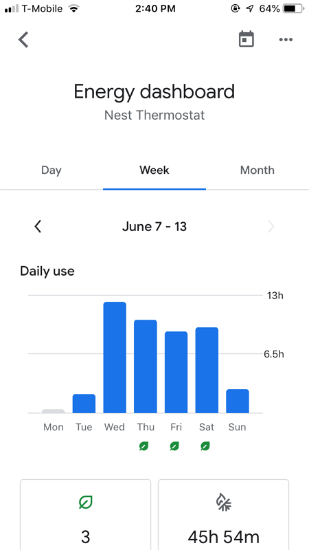 Google Home App裡可以看到能源的報告,記錄每天的使用狀況,有綠葉代表是節能的狀態。