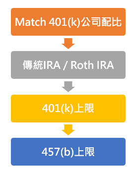 因為IRA帳戶可以選擇的投資標的比較彈性,所以排在第二,如果公司提供的401(k)有不錯的共同基金,也可以考慮放在IRA之前。
